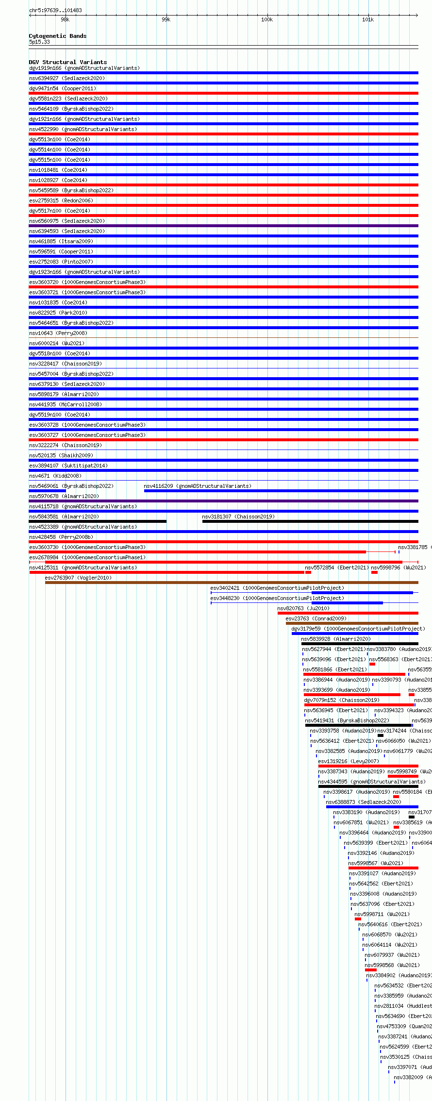 Variant DetailsVariant: esv2678984| Internal ID | 9945089 | | Landmark | | | Location Information | | | Cytoband | 5p15.33 | | Allele length | | Assembly | Allele length | | hg38 | 3845 | | hg19 | 3845 |