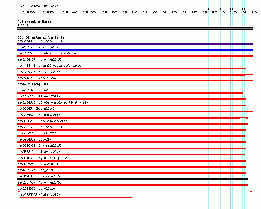 Variant DetailsVariant: esv2713930| Internal ID | 10297566 | | Landmark | | | Location Information | | | Cytoband | 1p31.1 | | Allele length | | Assembly | Allele length | | hg38 | 117 | | hg19 | 117 |