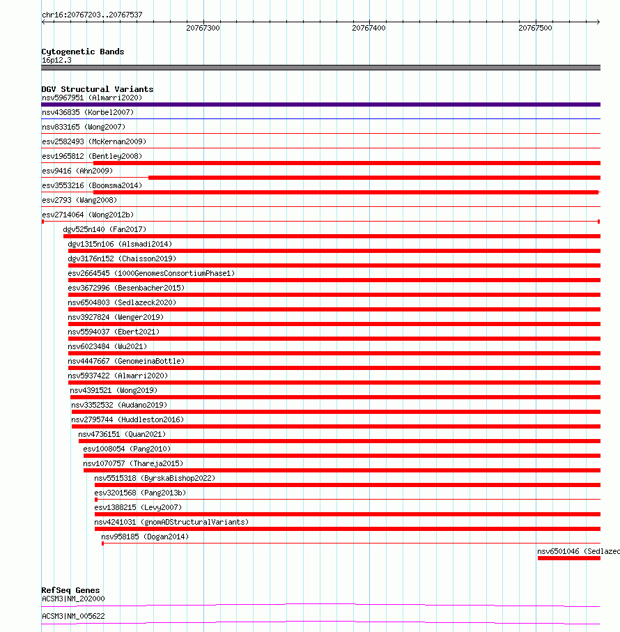Variant DetailsVariant: esv2714064 | Internal ID | 10297700 | | Landmark | | | Location Information | | | Cytoband | 16p12.3 | | Allele length | | Assembly | Allele length | | hg38 | 335 | | hg19 | 335 |