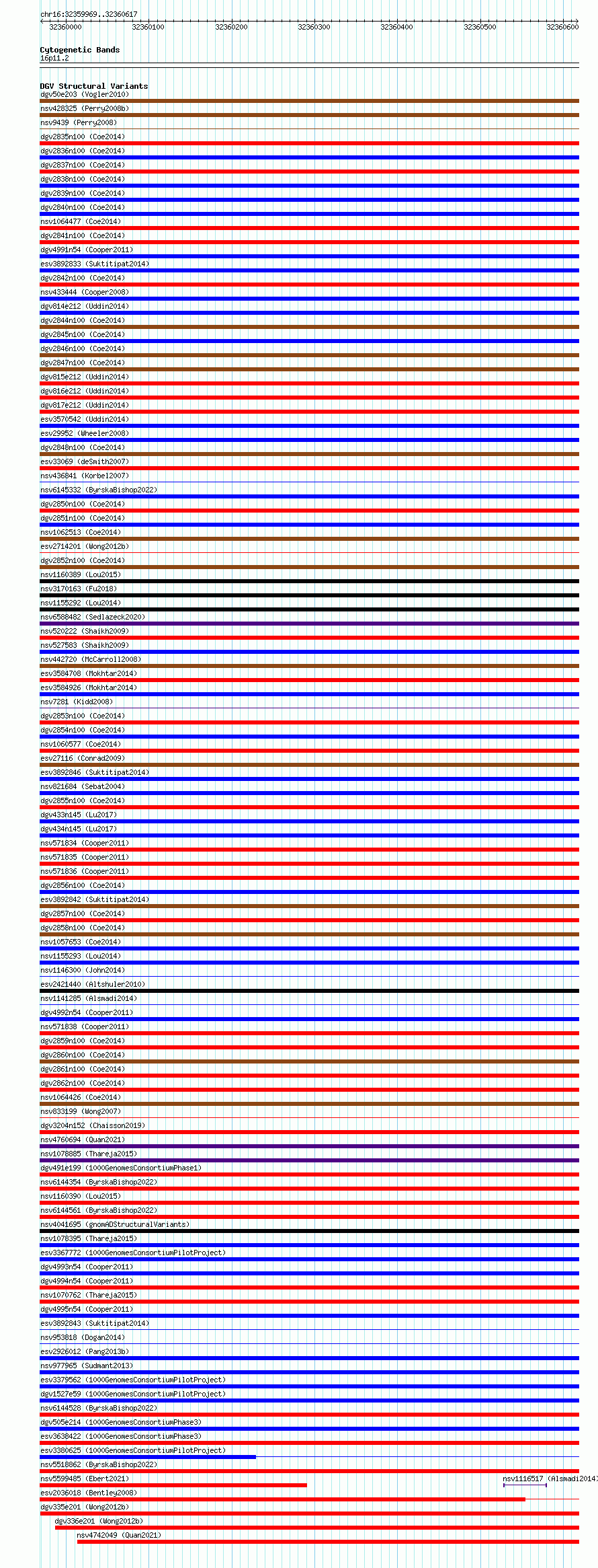 Variant DetailsVariant: esv2714203 | Internal ID | 10297839 | | Landmark | | | Location Information | | | Cytoband | 16p11.2 | | Allele length | | Assembly | Allele length | | hg38 | 649 | | hg19 | 649 |