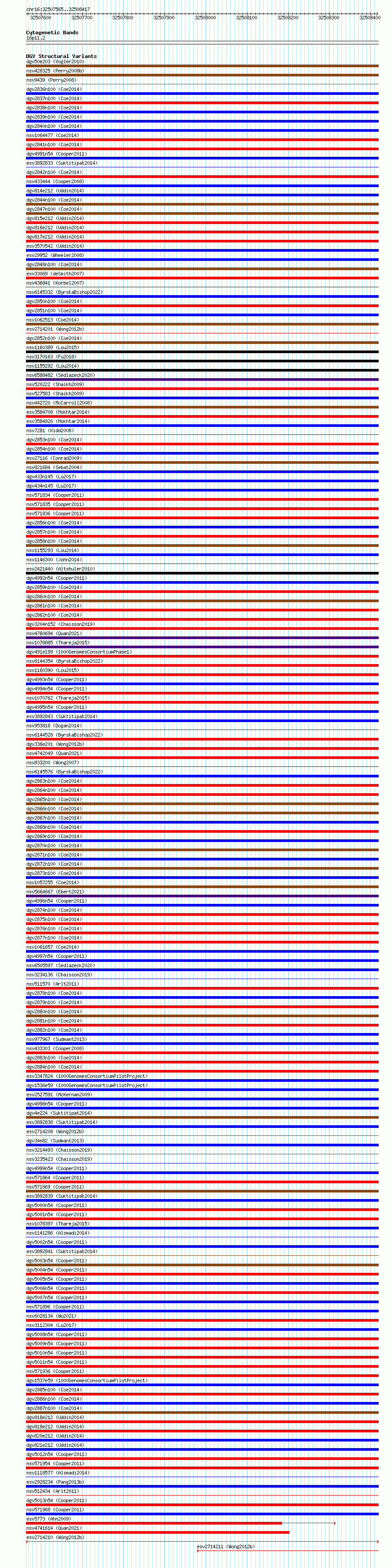 Variant DetailsVariant: esv2714210| Internal ID | 10297846 | | Landmark | | | Location Information | | | Cytoband | 16p11.2 | | Allele length | | Assembly | Allele length | | hg38 | 853 | | hg19 | 853 |