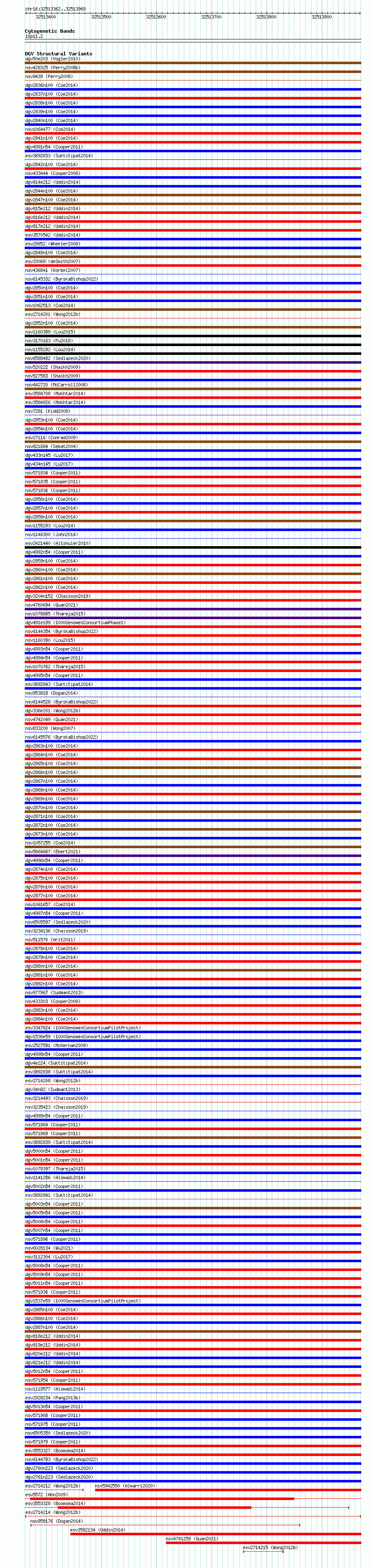 Variant DetailsVariant: esv2714214 | Internal ID | 10297850 | | Landmark | | | Location Information | | | Cytoband | 16p11.2 | | Allele length | | Assembly | Allele length | | hg38 | 608 | | hg19 | 608 |