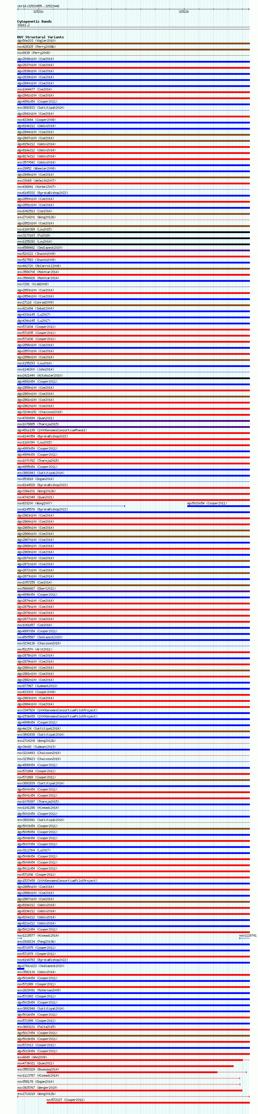 Variant DetailsVariant: esv2714219 | Internal ID | 10297855 | | Landmark | | | Location Information | | | Cytoband | 16p11.2 | | Allele length | | Assembly | Allele length | | hg38 | 1592 | | hg19 | 1592 |
