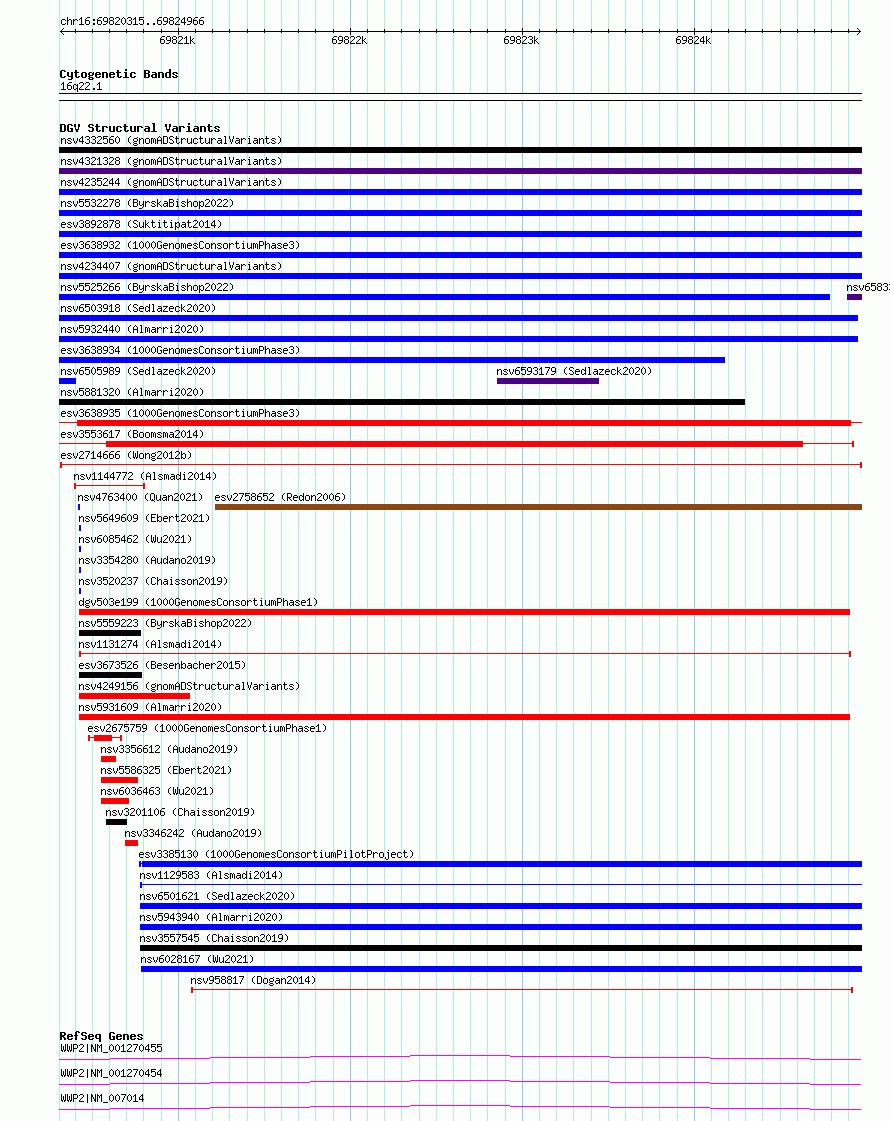 Variant DetailsVariant: esv2714666| Internal ID | 10298302 | | Landmark | | | Location Information | | | Cytoband | 16q22.1 | | Allele length | | Assembly | Allele length | | hg38 | 4652 | | hg19 | 4652 |