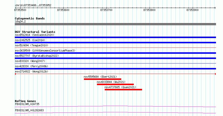 Variant DetailsVariant: esv2714922| Internal ID | 10298558 | | Landmark | | | Location Information | | | Cytoband | 16q24.2 | | Allele length | | Assembly | Allele length | | hg38 | 465 | | hg19 | 465 |