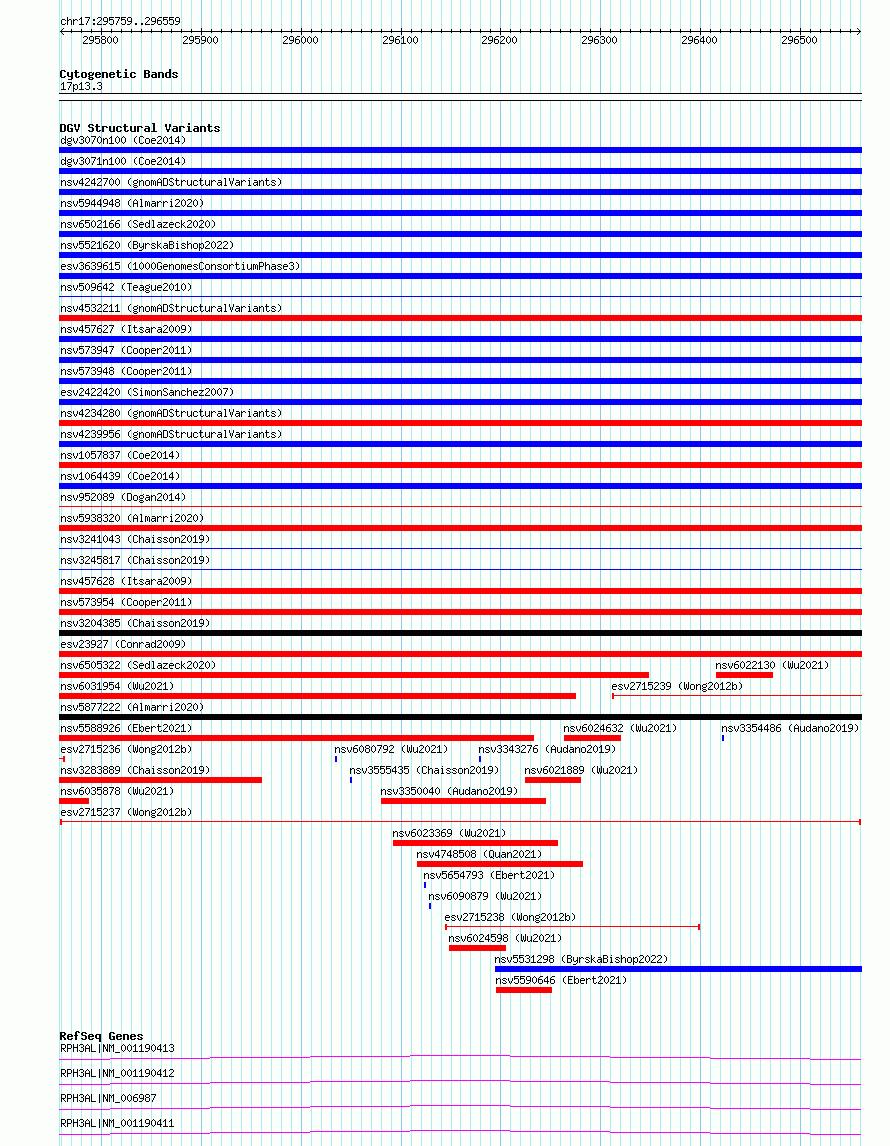 Variant DetailsVariant: esv2715237| Internal ID | 10298873 | | Landmark | | | Location Information | | | Cytoband | 17p13.3 | | Allele length | | Assembly | Allele length | | hg38 | 801 | | hg19 | 801 |