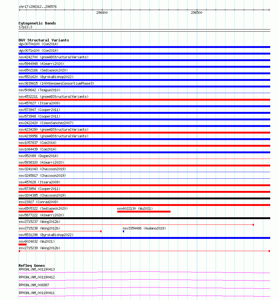 Variant DetailsVariant: esv2715239| Internal ID | 10298875 | | Landmark | | | Location Information | | | Cytoband | 17p13.3 | | Allele length | | Assembly | Allele length | | hg38 | 265 | | hg19 | 265 |