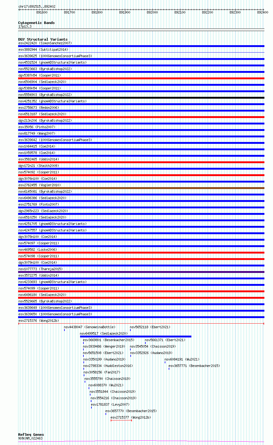 Variant DetailsVariant: esv2715376 | Internal ID | 10299012 | | Landmark | | | Location Information | | | Cytoband | 17p13.3 | | Allele length | | Assembly | Allele length | | hg38 | 888 | | hg19 | 888 |