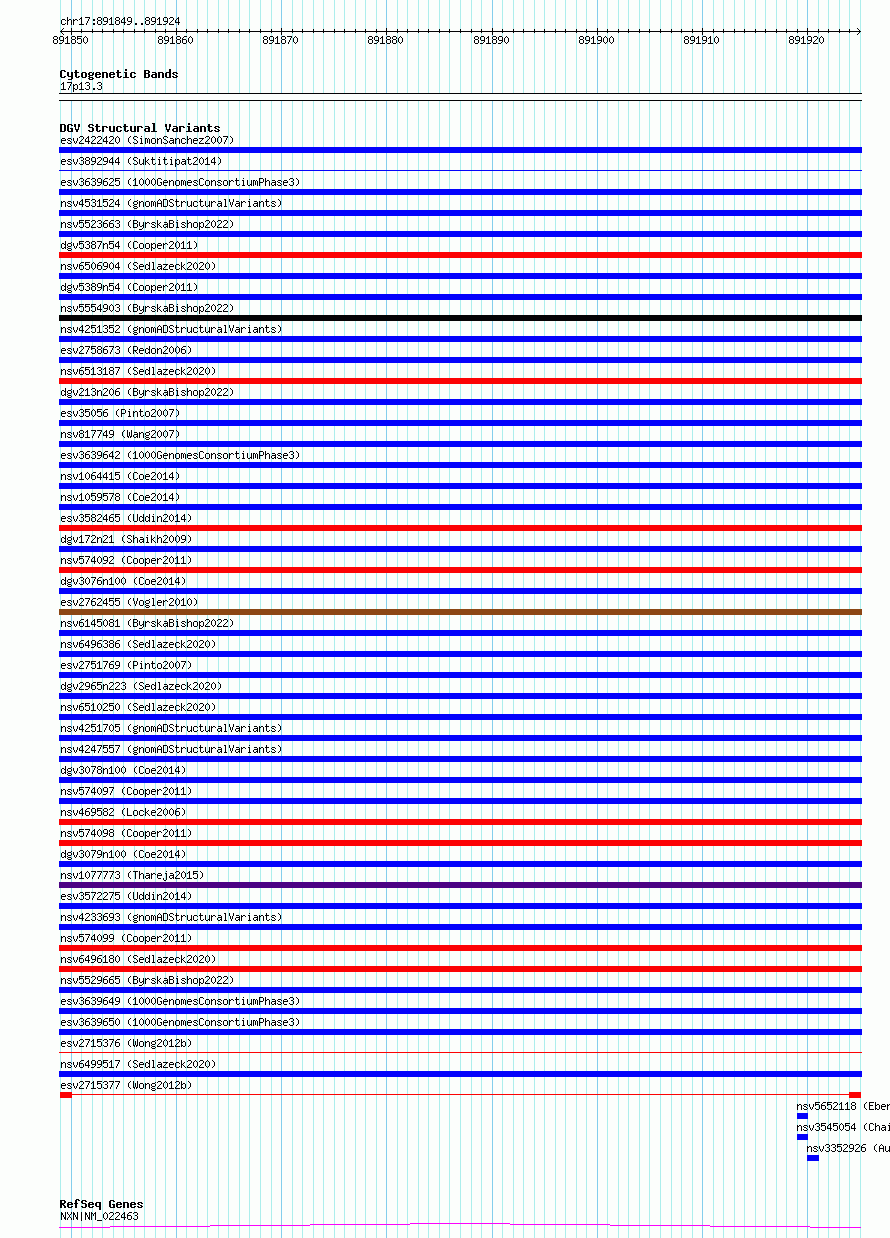 Variant DetailsVariant: esv2715377| Internal ID | 10299013 | | Landmark | | | Location Information | | | Cytoband | 17p13.3 | | Allele length | | Assembly | Allele length | | hg38 | 76 | | hg19 | 76 |