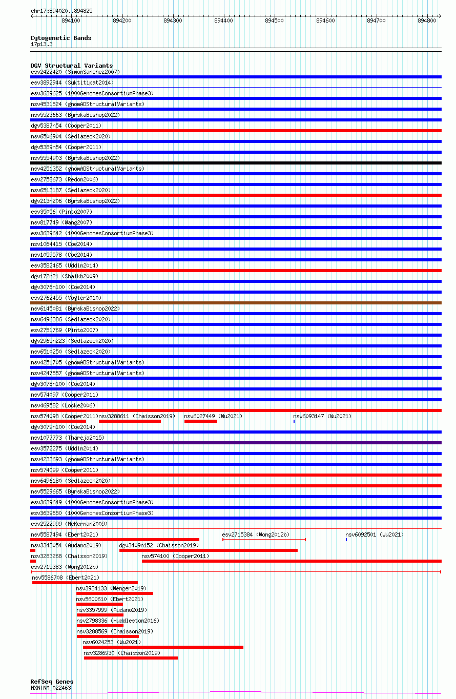 Variant DetailsVariant: esv2715383 | Internal ID | 10299019 | | Landmark | | | Location Information | | | Cytoband | 17p13.3 | | Allele length | | Assembly | Allele length | | hg38 | 806 | | hg19 | 806 |