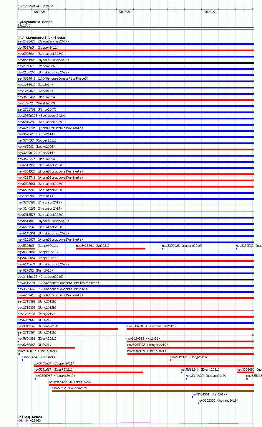 Variant DetailsVariant: esv2715394| Internal ID | 10299030 | | Landmark | | | Location Information | | | Cytoband | 17p13.3 | | Allele length | | Assembly | Allele length | | hg38 | 277 | | hg19 | 277 |