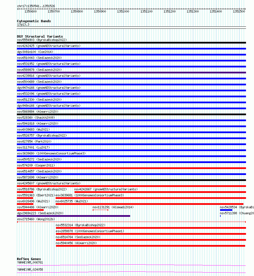 Variant DetailsVariant: esv2715460| Internal ID | 10299096 | | Landmark | | | Location Information | | | Cytoband | 17p13.3 | | Allele length | | Assembly | Allele length | | hg38 | 986 | | hg19 | 986 |