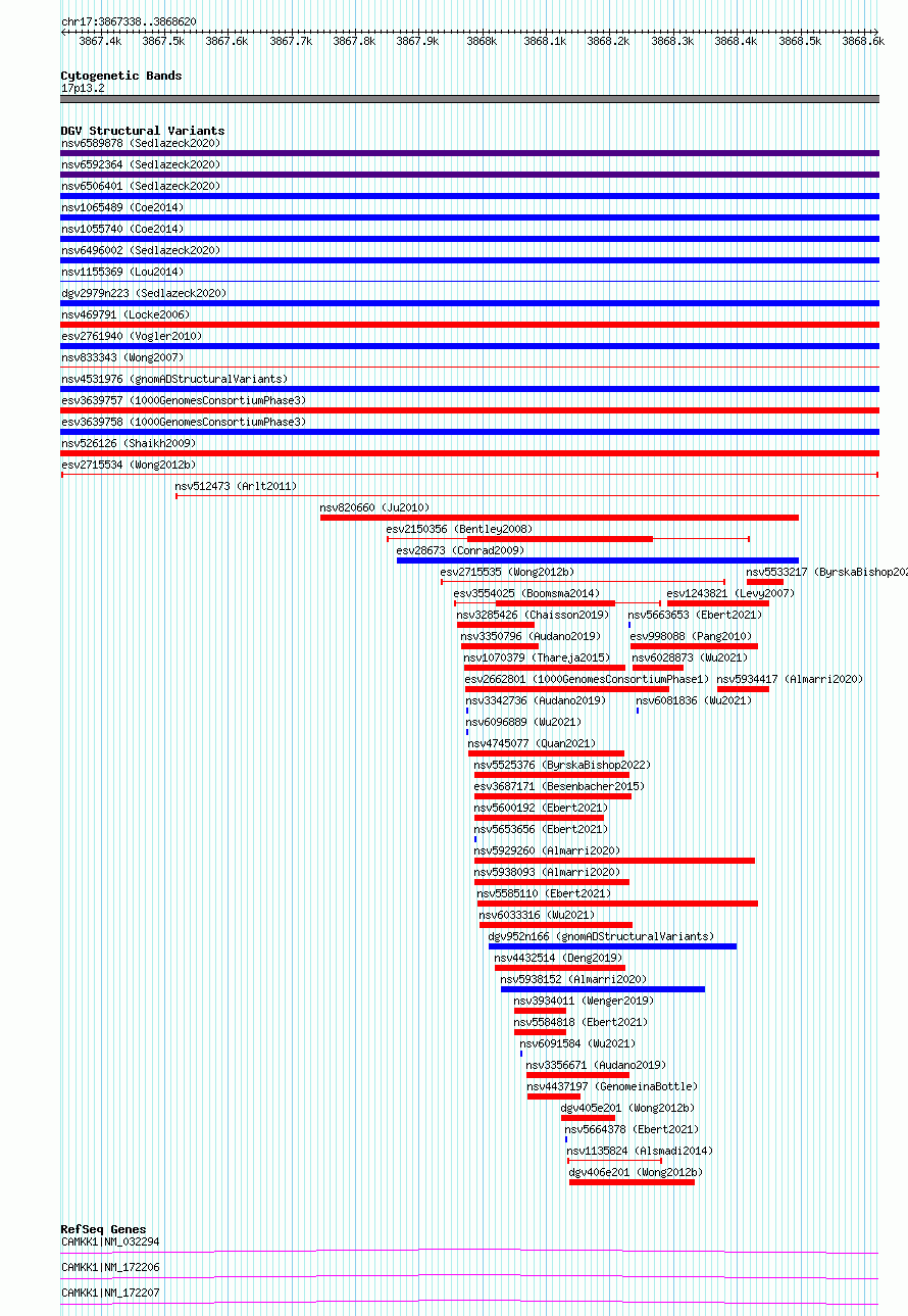 Variant DetailsVariant: esv2715534| Internal ID | 10299170 | | Landmark | | | Location Information | | | Cytoband | 17p13.2 | | Allele length | | Assembly | Allele length | | hg38 | 1283 | | hg19 | 1283 |