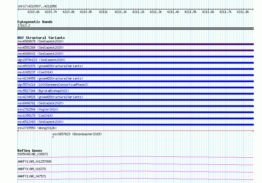 Variant DetailsVariant: esv2715550| Internal ID | 10299186 | | Landmark | | | Location Information | | | Cytoband | 17p13.2 | | Allele length | | Assembly | Allele length | | hg38 | 1350 | | hg19 | 1350 |