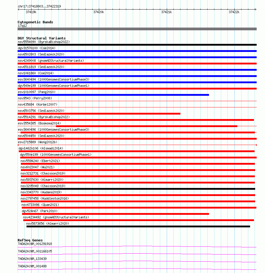 Variant DetailsVariant: esv2715889| Internal ID | 10299525 | | Landmark | | | Location Information | | | Cytoband | 17q12 | | Allele length | | Assembly | Allele length | | hg38 | 3517 | | hg19 | 3539 |