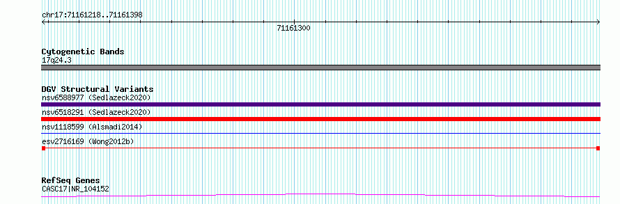 Variant DetailsVariant: esv2716169| Internal ID | 10299805 | | Landmark | | | Location Information | | | Cytoband | 17q24.3 | | Allele length | | Assembly | Allele length | | hg38 | 181 | | hg19 | 181 |