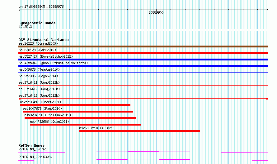 Variant DetailsVariant: esv2716413| Internal ID | 10300049 | | Landmark | | | Location Information | | | Cytoband | 17q25.3 | | Allele length | | Assembly | Allele length | | hg38 | 172 | | hg19 | 172 |