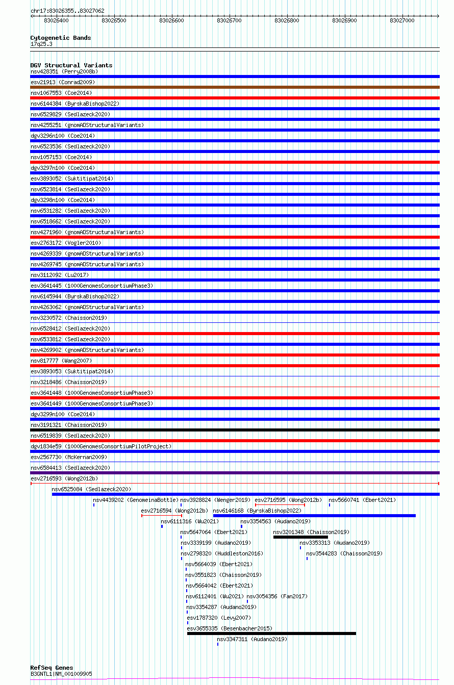 Variant DetailsVariant: esv2716593| Internal ID | 10300229 | | Landmark | | | Location Information | | | Cytoband | 17q25.3 | | Allele length | | Assembly | Allele length | | hg38 | 708 | | hg19 | 708 |