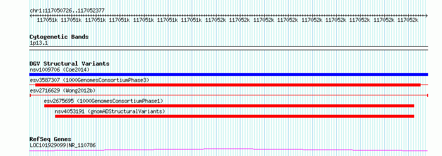 | Variant DetailsVariant: esv2716629| Internal ID | 9950917 |  | Landmark |  |  | Location Information |  |  | Cytoband | 1p13.1 |  | Allele length | | Assembly | Allele length |  | hg38 | 1652 |  | hg19 | 1652 |