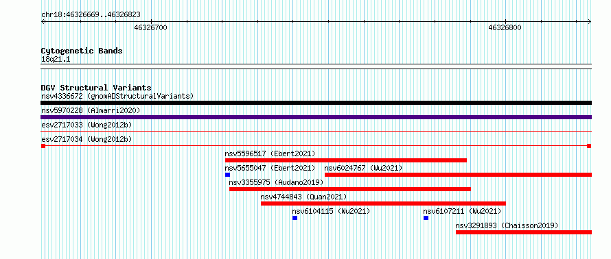 Variant DetailsVariant: esv2717034| Internal ID | 10300670 | | Landmark | | | Location Information | | | Cytoband | 18q21.1 | | Allele length | | Assembly | Allele length | | hg38 | 155 | | hg19 | 155 |