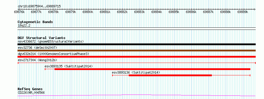Variant DetailsVariant: esv2717304| Internal ID | 9951593 | | Landmark | | | Location Information | | | Cytoband | 18q22.2 | | Allele length | | Assembly | Allele length | | hg38 | 13812 | | hg19 | 13812 |