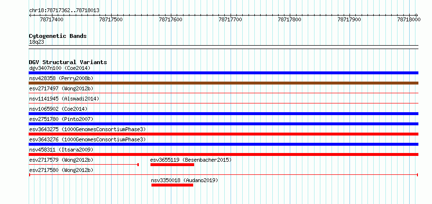 Variant DetailsVariant: esv2717580| Internal ID | 9951871 | | Landmark | | | Location Information | | | Cytoband | 18q23 | | Allele length | | Assembly | Allele length | | hg38 | 652 | | hg19 | 652 |