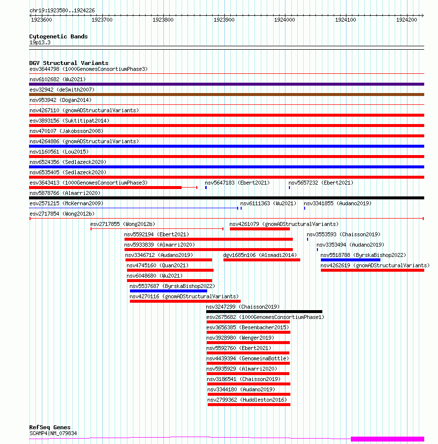 Variant DetailsVariant: esv2717854| Internal ID | 10301490 | | Landmark | | | Location Information | | | Cytoband | 19p13.3 | | Allele length | | Assembly | Allele length | | hg38 | 647 | | hg19 | 647 |