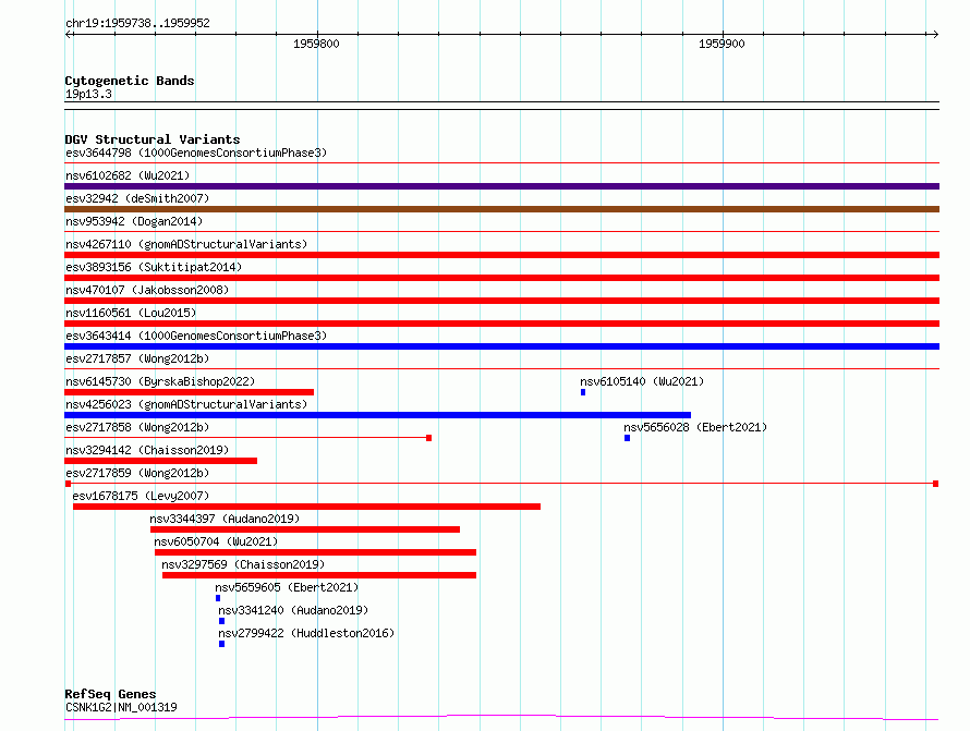 Variant DetailsVariant: esv2717859| Internal ID | 10301495 | | Landmark | | | Location Information | | | Cytoband | 19p13.3 | | Allele length | | Assembly | Allele length | | hg38 | 215 | | hg19 | 215 |