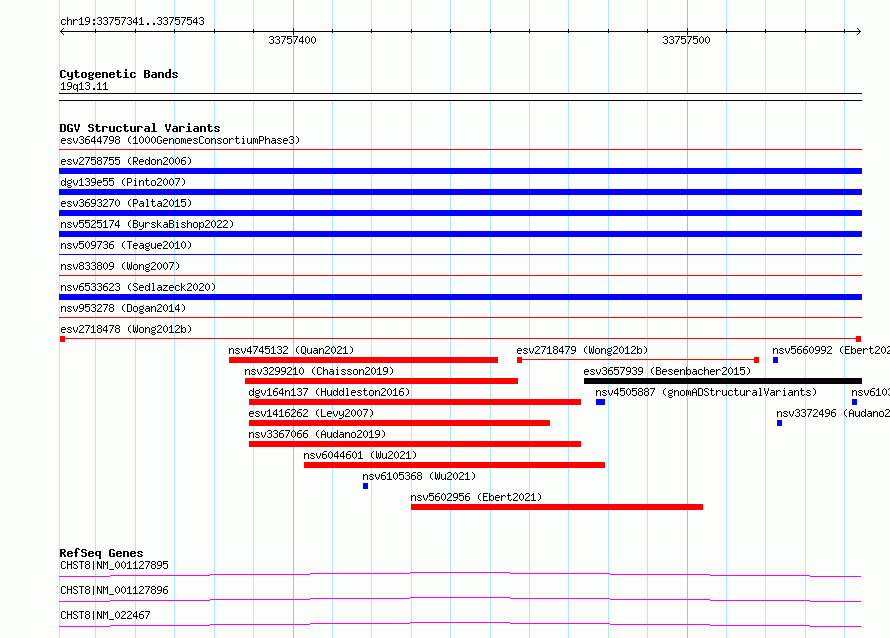 Variant DetailsVariant: esv2718478| Internal ID | 10302114 | | Landmark | | | Location Information | | | Cytoband | 19q13.11 | | Allele length | | Assembly | Allele length | | hg38 | 203 | | hg19 | 203 |