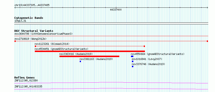 Variant DetailsVariant: esv2718619| Internal ID | 9952911 | | Landmark | | | Location Information | | | Cytoband | 19q13.31 | | Allele length | | Assembly | Allele length | | hg38 | 181 | | hg19 | 181 |