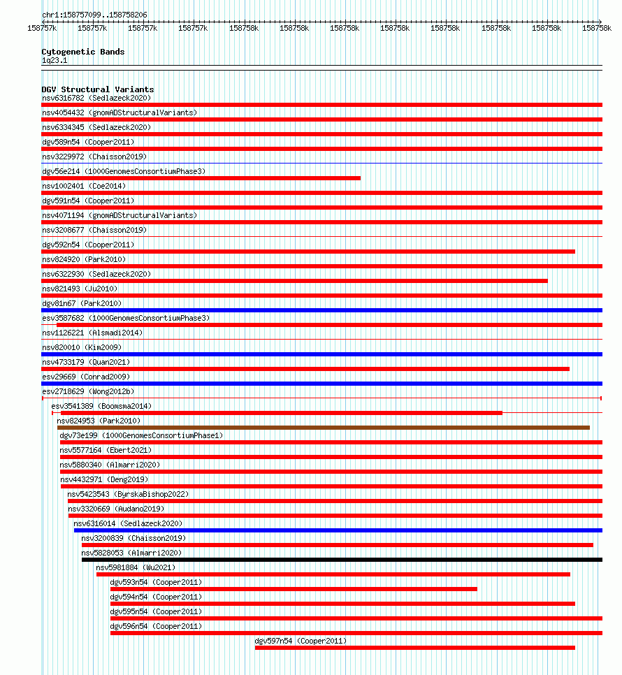 Variant DetailsVariant: esv2718629 | Internal ID | 10302265 | | Landmark | | | Location Information | | | Cytoband | 1q23.1 | | Allele length | | Assembly | Allele length | | hg38 | 1108 | | hg19 | 1108 |