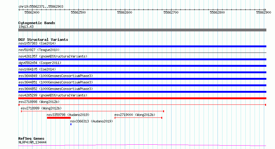 | Variant Type | CNV deletion | Copy Number | | Allele State | | Allele Origin | | Probe Count | | Validation Flag | | Merged Status | M | Merged Variants | | Supporting Variants | essv6842287, essv6835936, essv6961105, essv6786820 | Samples | SSM026, SSM001, SSM082, SSM010 | Known Genes | NLRP4 | Method | Sequencing | Analysis | Breakdancer:4 times standard deviation,VariationHunter:4 times standard deviation and at least 3 supportting reads | Platform | Illumina HiSeq 2000 | Comments | | Reference | Wong_et_al_2012b | Pubmed ID | 23290073 | Accession Number(s) | esv2718998
