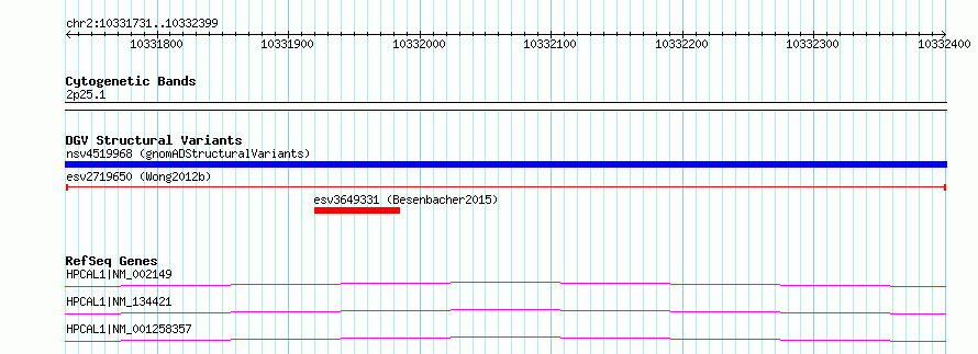 Variant DetailsVariant: esv2719650| Internal ID | 9953944 | | Landmark | | | Location Information | | | Cytoband | 2p25.1 | | Allele length | | Assembly | Allele length | | hg38 | 669 | | hg19 | 669 |
