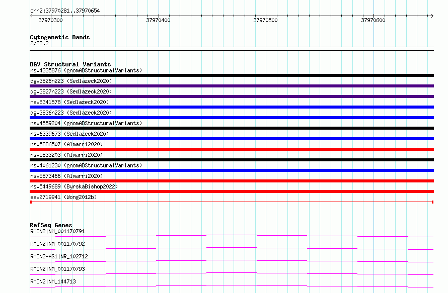 Variant DetailsVariant: esv2719941| Internal ID | 10303577 | | Landmark | | | Location Information | | | Cytoband | 2p22.2 | | Allele length | | Assembly | Allele length | | hg38 | 374 | | hg19 | 374 |