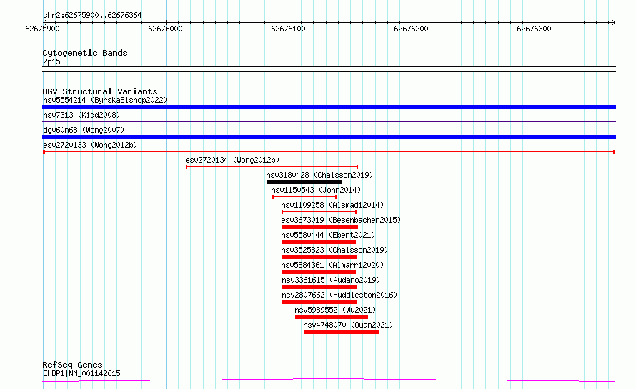 Variant DetailsVariant: esv2720133| Internal ID | 10303769 | | Landmark | | | Location Information | | | Cytoband | 2p15 | | Allele length | | Assembly | Allele length | | hg38 | 465 | | hg19 | 465 |