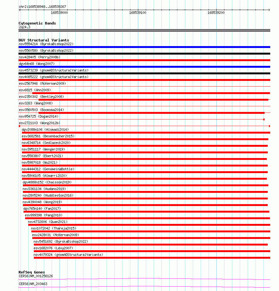 | | Variant Type | CNV deletion | | Copy Number | | | Allele State | | | Allele Origin | | | Probe Count | | | Validation Flag | | | Merged Status | M | | Merged Variants | | | Supporting Variants | essv6825434, essv6973123, essv6962222, essv6942274, essv6683182, essv6906537, essv6847684, essv6859683, essv6817075, essv6968402, essv6707634, essv6807703, essv6686502, essv6955463, essv6853870, essv6797901, essv6864470, essv6847621, essv6669650, essv6892693, essv6793731, essv6889369, essv6675606 | | Samples | SSM071, SSM027, SSM075, SSM011, SSM087, SSM097, SSM088, SSM041, SSM023, SSM028, SSM029, SSM026, SSM089, SSM035, SSM032, SSM031, SSM014, SSM086, SSM072, SSM078, SSM080, SSM034, SSM098 | | Known Genes | CERS6 | | Method | Sequencing | | Analysis | Breakdancer:4 times standard deviation,VariationHunter:4 times standard deviation and at least 3 supportting reads | | Platform | Illumina HiSeq 2000 | | Comments | | | Reference | Wong_et_al_2012b | | Pubmed ID | 23290073 | | Accession Number(s) | esv2721103