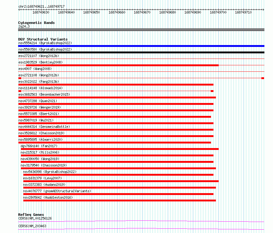 Variant DetailsVariant: esv2721108| Internal ID | 10304744 | | Landmark | | | Location Information | | | Cytoband | 2q24.3 | | Allele length | | Assembly | Allele length | | hg38 | 97 | | hg19 | 97 |