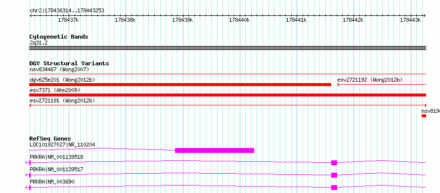 Variant DetailsVariant: esv2721191 Internal ID | 9955487 | Landmark | | Location Information | | Cytoband | 2q31.2 | Allele length | Assembly | Allele length | hg38 | 6940 | hg19 | 6940 |