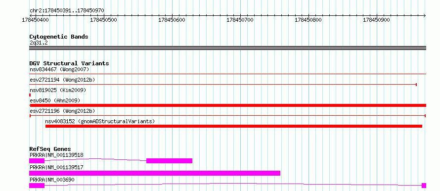 |  | Variant Type | CNV deletion |  | Copy Number |  |  | Allele State |  |  | Allele Origin |  |  | Probe Count |  |  | Validation Flag |  |  | Merged Status | M |  | Merged Variants |  |  | Supporting Variants | essv6898950, essv6844234, essv6922187, essv6797912, essv6710995, essv6883561, essv6889380, essv6832984, essv6807715, essv6683194, essv6953640, essv6825446, essv6886291, essv6817093, essv6804742, essv6859699, essv6942283, essv6762094, essv6707644, essv6675622, essv6917875, essv6672321, essv6813528, essv6962237, essv6829390 |  | Samples | SSM100, SSM027, SSM075, SSM097, SSM074, SSM042, SSM088, SSM041, SSM023, SSM018, SSM096, SSM062, SSM017, SSM032, SSM085, SSM081, SSM072, SSM082, SSM078, SSM005, SSM080, SSM077, SSM095, SSM034, SSM004 |  | Known Genes | MIR548N, PRKRA |  | Method | Sequencing |  | Analysis | Breakdancer:4 times standard deviation,VariationHunter:4 times standard deviation and at least 3 supportting reads |  | Platform | Illumina HiSeq 2000 |  | Comments |  |  | Reference | Wong_et_al_2012b |  | Pubmed ID | 23290073 |  | Accession Number(s) | esv2721196