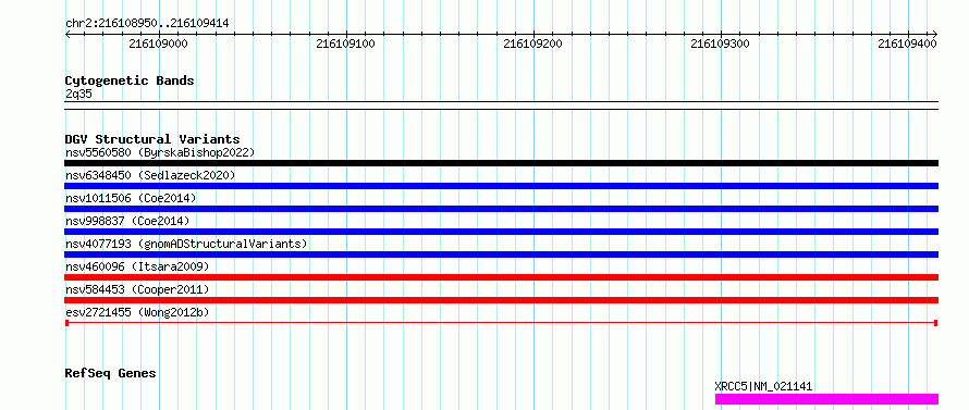 Variant DetailsVariant: esv2721455| Internal ID | 10305091 | | Landmark | | | Location Information | | | Cytoband | 2q35 | | Allele length | | Assembly | Allele length | | hg38 | 465 | | hg19 | 465 |