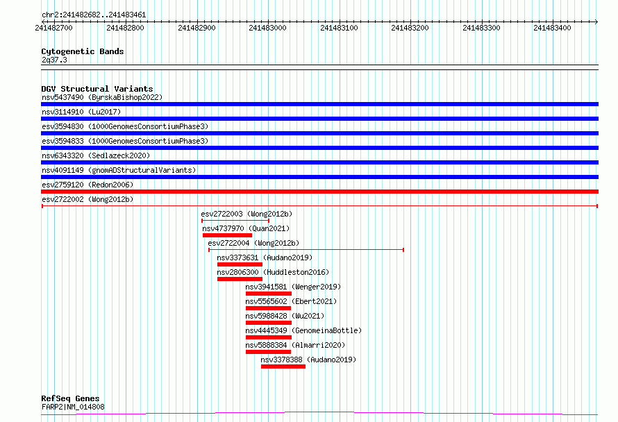 Variant DetailsVariant: esv2722002| Internal ID | 10305638 | | Landmark | | | Location Information | | | Cytoband | 2q37.3 | | Allele length | | Assembly | Allele length | | hg38 | 780 | | hg19 | 780 |