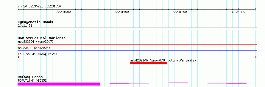 | Variant Type | CNV deletion | Copy Number | | Allele State | | Allele Origin | | Probe Count | | Validation Flag | | Merged Status | M | Merged Variants | | Supporting Variants | essv6696540, essv6902123, essv6921175 | Samples | SSM017, SSM037, SSM012 | Known Genes | POFUT1 | Method | Sequencing | Analysis | Breakdancer:4 times standard deviation,VariationHunter:4 times standard deviation and at least 3 supportting reads | Platform | Illumina HiSeq 2000 | Comments | | Reference | Wong_et_al_2012b | Pubmed ID | 23290073 | Accession Number(s) | esv2722341