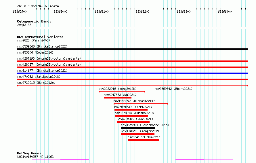 Variant DetailsVariant: esv2722915| Internal ID | 10306551 | | Landmark | | | Location Information | | | Cytoband | 20q13.33 | | Allele length | | Assembly | Allele length | | hg38 | 561 | | hg19 | 561 |