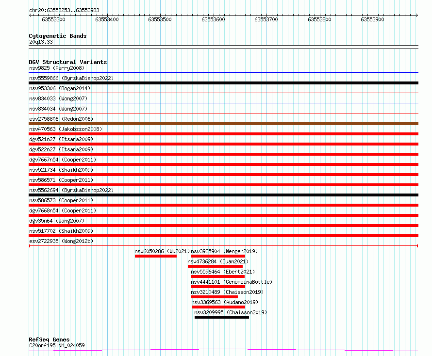 Variant DetailsVariant: esv2722935| Internal ID | 10306571 | | Landmark | | | Location Information | | | Cytoband | 20q13.33 | | Allele length | | Assembly | Allele length | | hg38 | 731 | | hg19 | 731 |
