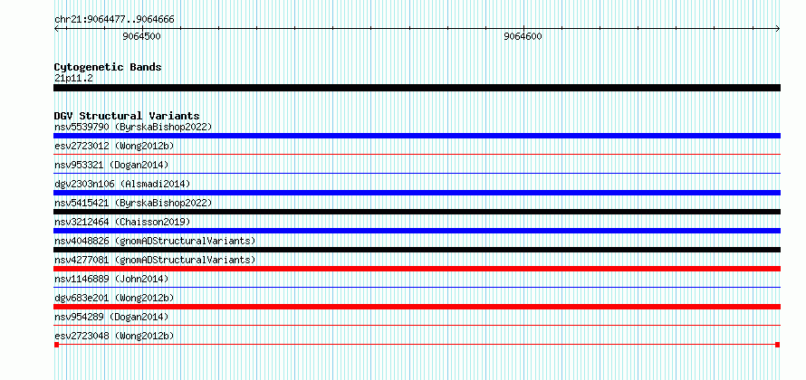 Variant DetailsVariant: esv2723048| Internal ID | 10306684 | | Landmark | | | Location Information | | | Cytoband | 21p11.2 | | Allele length | | Assembly | Allele length | | hg38 | 190 | | hg19 | 190 |