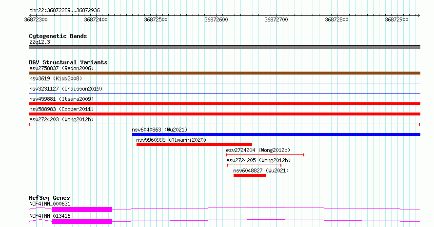 Variant DetailsVariant: esv2724203| Internal ID | 10307839 | | Landmark | | | Location Information | | | Cytoband | 22q12.3 | | Allele length | | Assembly | Allele length | | hg38 | 648 | | hg19 | 648 |