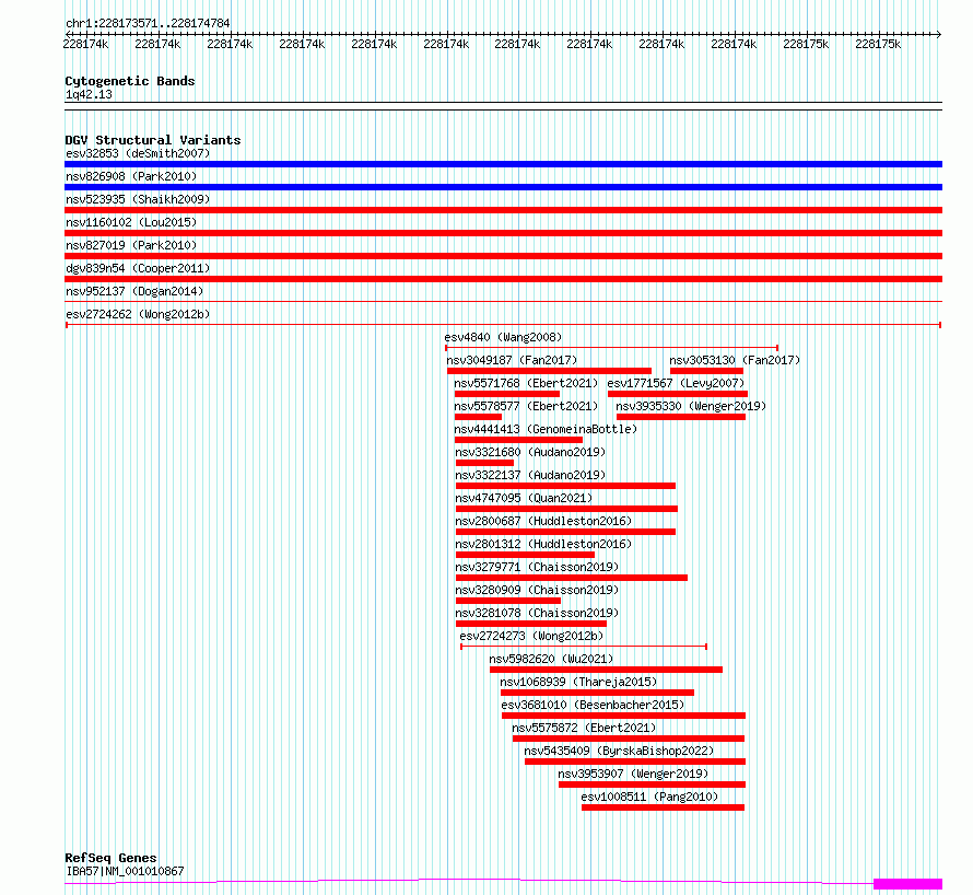 Variant DetailsVariant: esv2724262 | Internal ID | 10307898 | | Landmark | | | Location Information | | | Cytoband | 1q42.13 | | Allele length | | Assembly | Allele length | | hg38 | 1214 | | hg19 | 1214 |