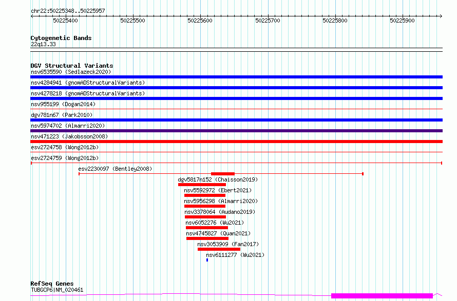 Variant DetailsVariant: esv2724759| Internal ID | 10308395 | | Landmark | | | Location Information | | | Cytoband | 22q13.33 | | Allele length | | Assembly | Allele length | | hg38 | 610 | | hg19 | 610 |