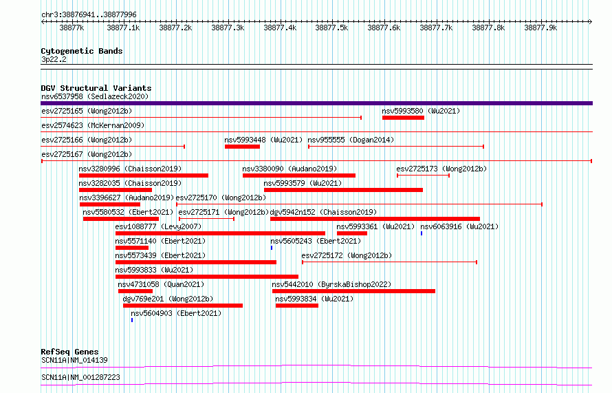 | | Variant Type | CNV deletion | | Copy Number | | | Allele State | | | Allele Origin | | | Probe Count | | | Validation Flag | | | Merged Status | M | | Merged Variants | | | Supporting Variants | essv6955696, essv6742552, essv6673121, essv6881553, essv6802017, essv6906685, essv6707736, essv6892800, essv6700209, essv6704312, essv6807807, essv6854069, essv6889486, essv6933882, essv6921429, essv6859855, essv6698988, essv6848643, essv6847894, essv6914435, essv6906683, essv6683290, essv6817222, essv6962436, essv6766938, essv6864645, essv6817223, essv6864644, essv6938214, essv6917988, essv6859853, essv6942437, essv6947053, essv6854070, essv6872132, essv6669850 | | Samples | SSM027, SSM024, SSM075, SSM011, SSM064, SSM087, SSM097, SSM039, SSM073, SSM088, SSM041, SSM023, SSM021, SSM026, SSM089, SSM017, SSM003, SSM031, SSM014, SSM086, SSM006, SSM040, SSM078, SSM016, SSM053, SSM005, SSM022, SSM091, SSM034, SSM098, SSM012 | | Known Genes | SCN11A | | Method | Sequencing | | Analysis | Breakdancer:4 times standard deviation,VariationHunter:4 times standard deviation and at least 3 supportting reads | | Platform | Illumina HiSeq 2000 | | Comments | | | Reference | Wong_et_al_2012b | | Pubmed ID | 23290073 | | Accession Number(s) | esv2725167
