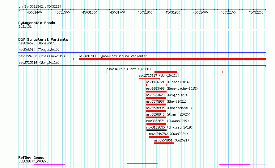 Variant DetailsVariant: esv2725216 | Internal ID | 10308852 | | Landmark | | | Location Information | | | Cytoband | 3p21.31 | | Allele length | | Assembly | Allele length | | hg38 | 893 | | hg19 | 893 |